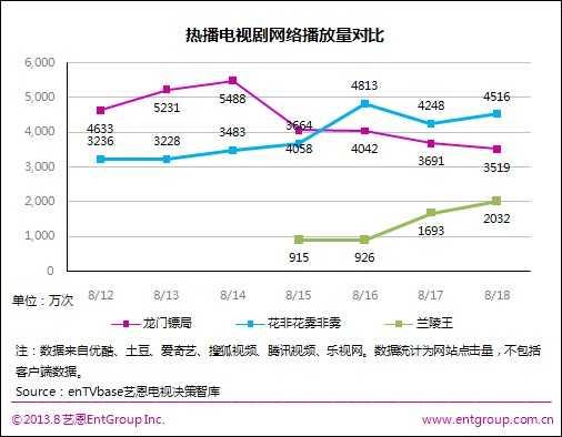据艺恩enTVbase电视决策智库统计,第三十三周网络TOP10电视剧累计播放量12.1亿,环比下降13.9%。《龙门镖局》继续稳居冠军;《花非花雾非雾》昂首挺进第二位;古装大戏《兰陵王》本周开播,空降榜单第七位;同期开播的热门剧《武松》、《失恋33天》未能挤进榜单。