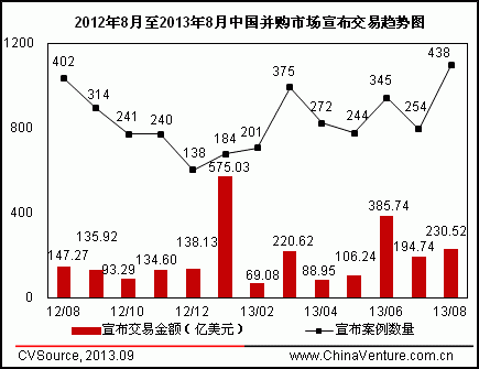 根据ChinaVenture投中集团旗下金融数据产品CVSource统计显示,2013年8月中国并购市场宣布交易规模为230.52亿美元,环比上升18%;并购交易案例数量为438起,较上个月254起环比上升72%(见图1)。