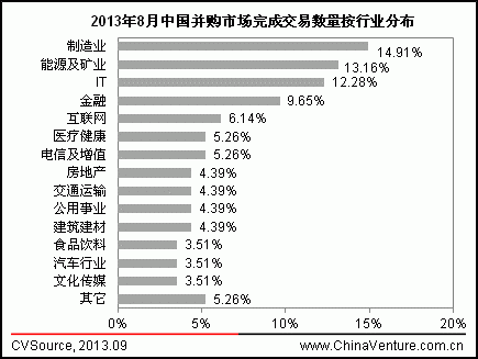 图4 2013年8月中国并购市场完成交易数量按行业分布