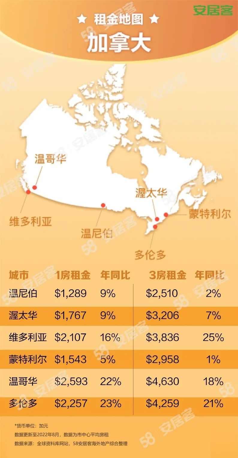 安居客海外低产最新数据显示,截止今年8月,加拿大全国平均房租中位数为$1750加元,比去年同期增长了7%。