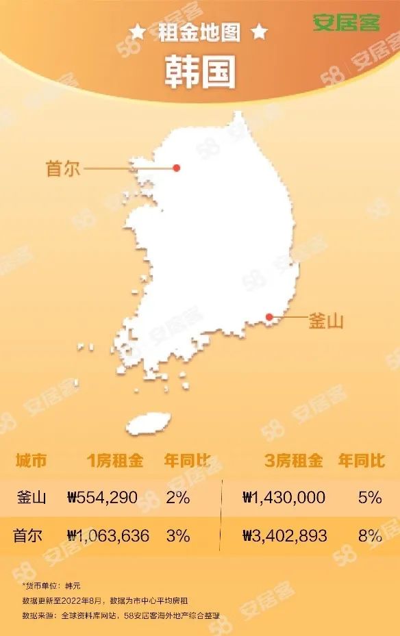 据安居客海外地产数据显示,韩国首都首尔的一房月平均租金为1,063,636韩元(约合人民币5476元),三房月平均租金为3,402,893韩元(约合人民币1.75万元)。