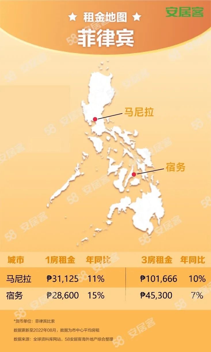 截至 2022年8月,菲律宾首都马尼拉一房月平均租金为31,125比索(约合人民币3,810元), 三房月平均租金为101,666比索(约合人民币1.26万元),租金收入非常可观。