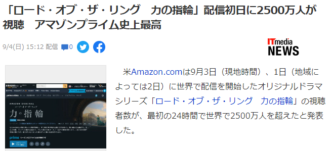 亚马逊斥巨资打造的《指环王》剧版《指环王:力量之戒》第一季于当地时间9月2日正式开播,官方宣布,最新统计在首播24小时内同时观看人数最高超过2500万,创下亚马逊史上新纪录。