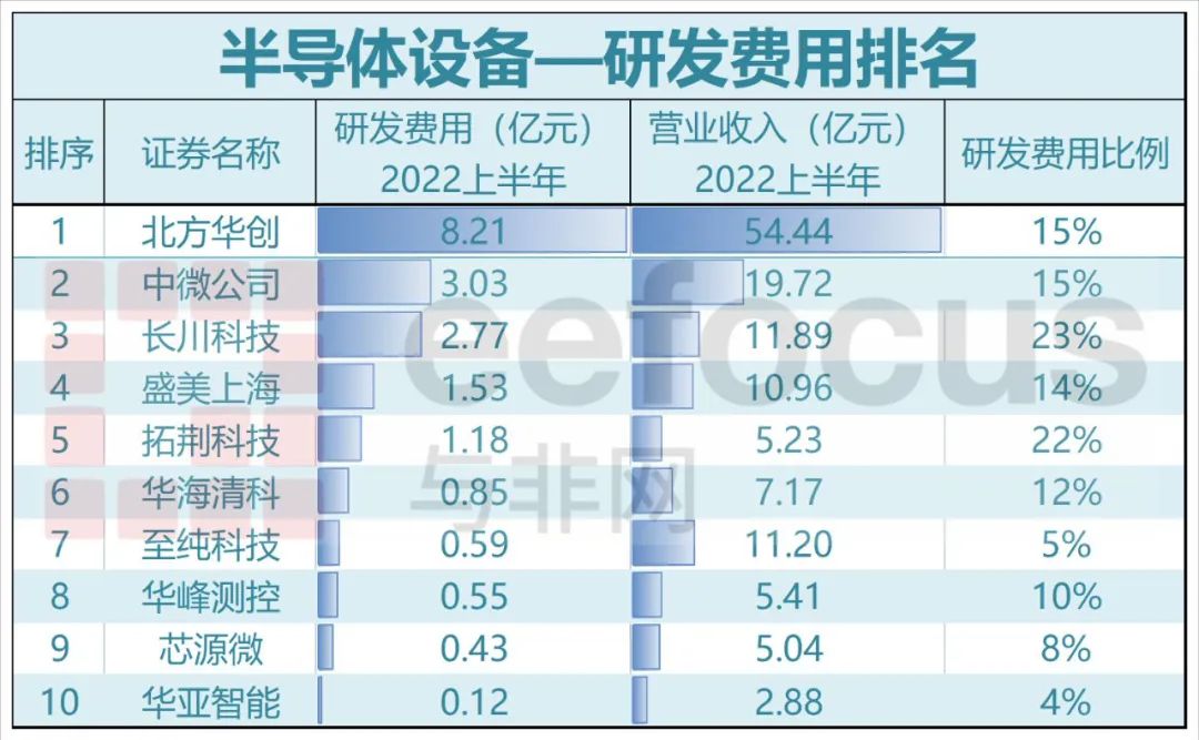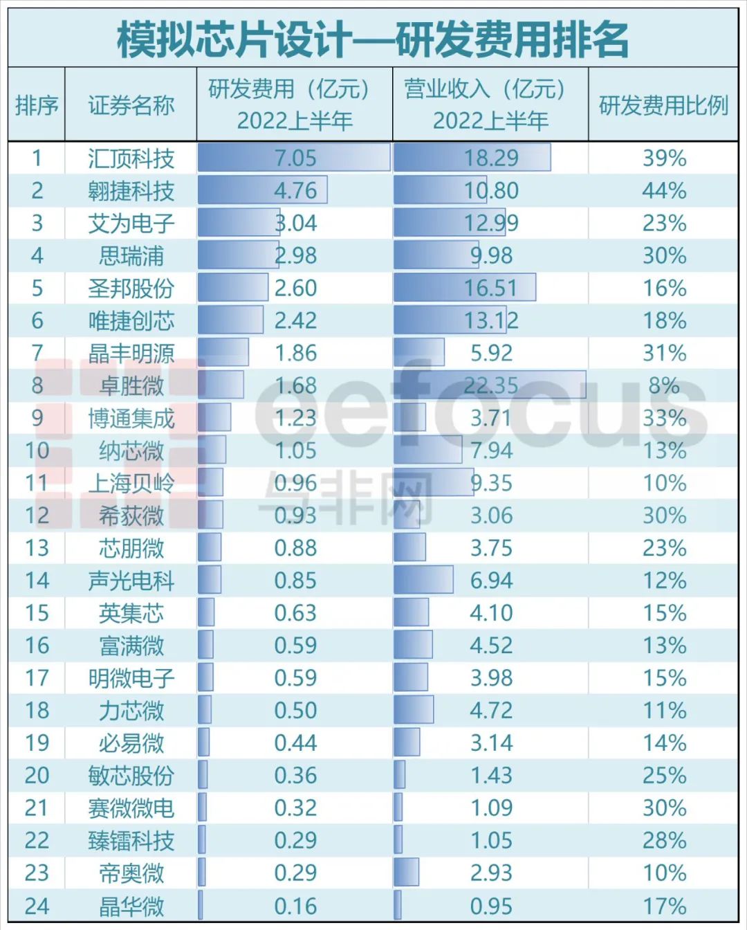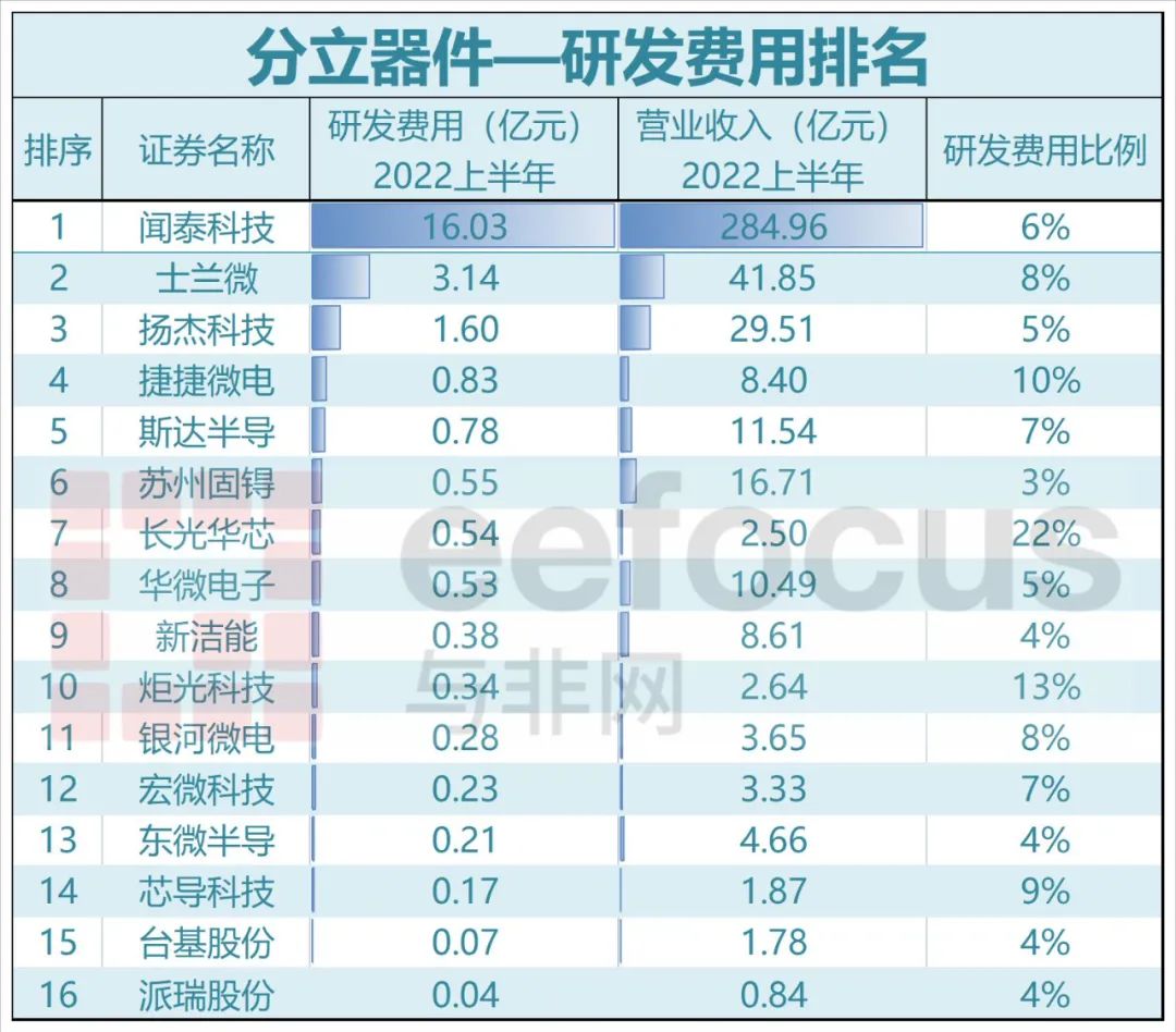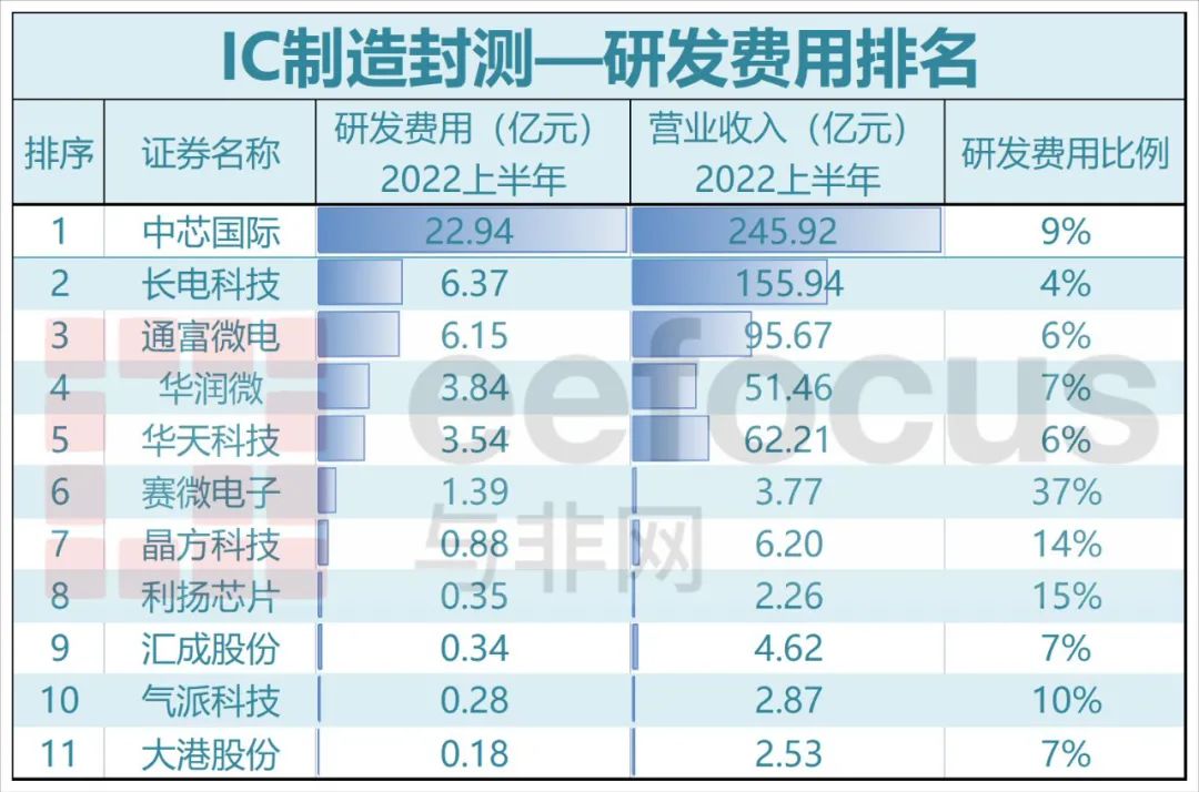 2022年上半年A股半导体公司研发费用排名 本文统计了A股半导体各细分行业公司2022年上半年的研发费用,从数据可以看出,行业研发费用比例Top5的依次是EDA、模拟芯片设计、数字芯片设计、半导体设备、IC制造封测。其中EDA公司的平均研发费用比例高达60%,远远高于其他细分行业。 而从研发费用绝对值来看,上半年研发费用支出超过2亿元的半导体公司,共42个,主要集中在数字芯片设计、面板、模拟芯片设计、IC制造封测、半导体设备,分别有15、7、6、5、3个。 注:行业分类标准为申银万国行业(三级) 本文来源:与非网 更多阅读:热云数据:2018年双11电商APP广告投放行为洞察专题报告CTR:2021年5月电视广告花费同比增长12.5%GMIC北京2017,智线为你解读移动游戏出海广告素材全球趋势!全球互联网发展报告2019:为何美国称霸、中国崛起?CCFA:2020年中国便利店TOP100榜单ECS 2020|第二届中国电子通信与半导体CIO峰会正式启动!百度联盟:2020年Q1行业流量分析与洞察2019年研招报考数据中国移动:中国5G产业发展与投资报告诺亚财富:2018公开市场白皮书中美科研实力比较研究:基于《2016研究前沿》的分析前程无忧:2021年Q1集成电路/半导体市场供需报告CCFA:2019年中国超市百强乐普医疗新冠病毒抗体胶体金法检测试剂盒、红外测温仪等产品已供往数十国家Demand Gen :制造商将数字转换扩展到销售和营销报告