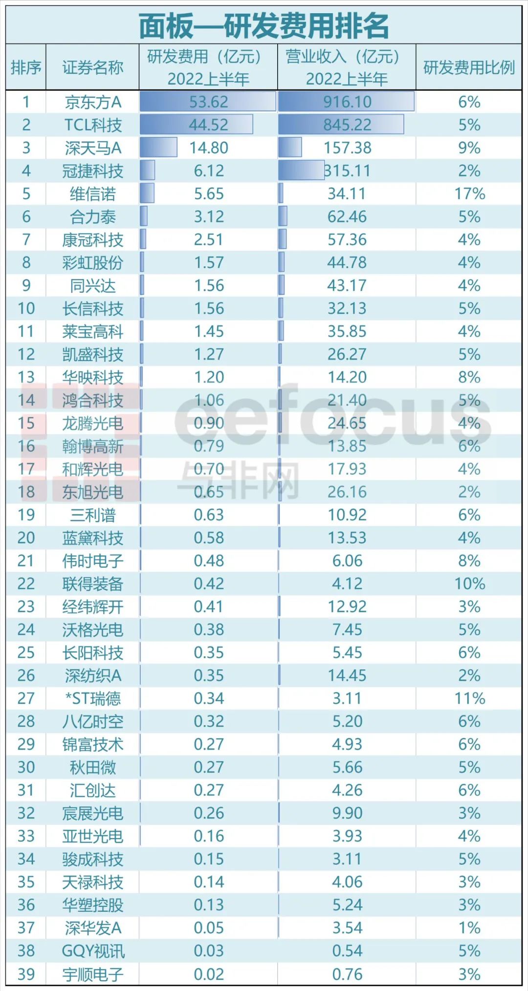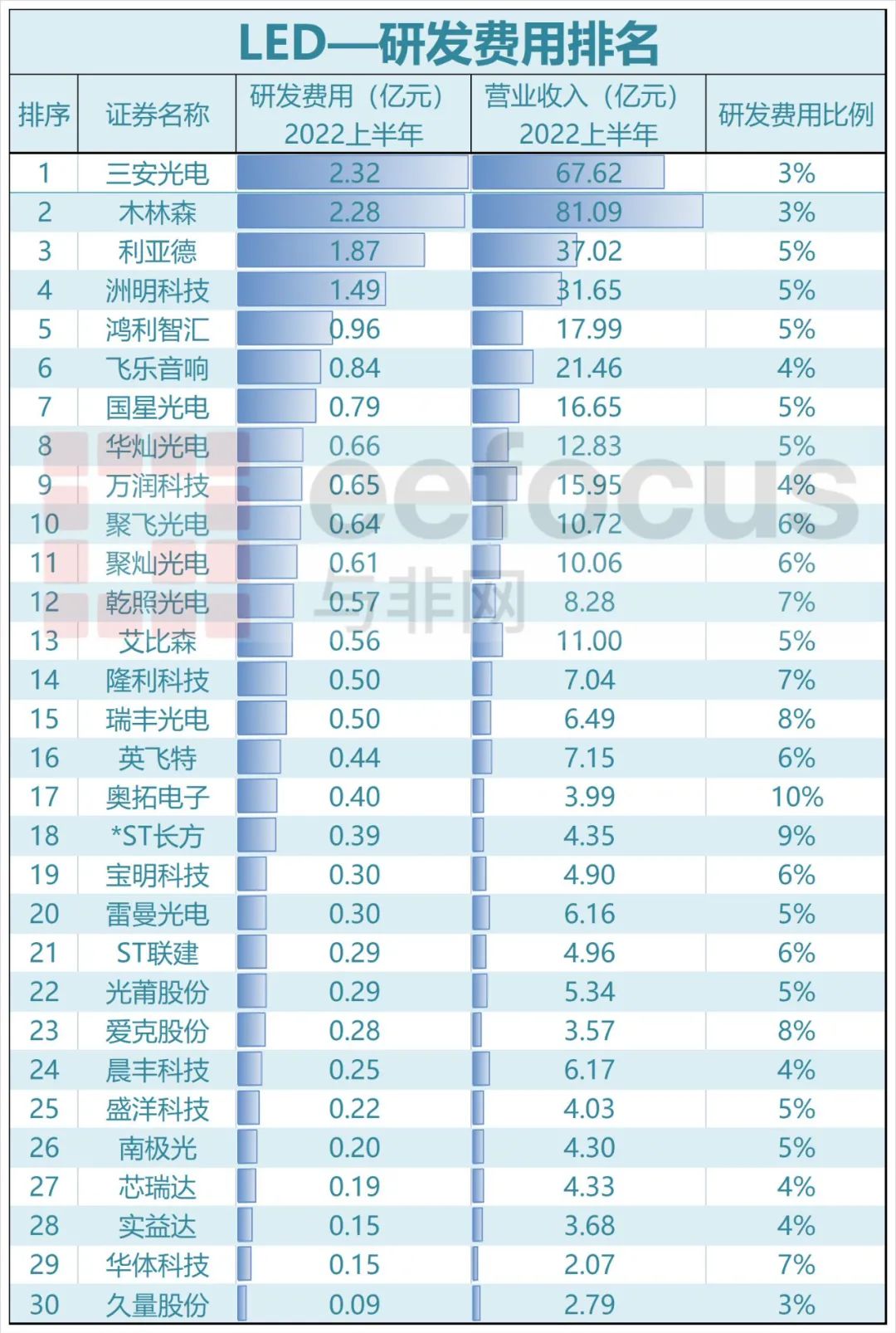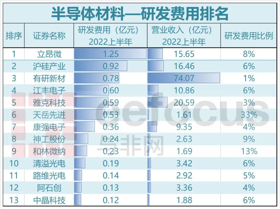 2022年上半年A股半导体公司研发费用排名 本文统计了A股半导体各细分行业公司2022年上半年的研发费用,从数据可以看出,行业研发费用比例Top5的依次是EDA、模拟芯片设计、数字芯片设计、半导体设备、IC制造封测。其中EDA公司的平均研发费用比例高达60%,远远高于其他细分行业。 而从研发费用绝对值来看,上半年研发费用支出超过2亿元的半导体公司,共42个,主要集中在数字芯片设计、面板、模拟芯片设计、IC制造封测、半导体设备,分别有15、7、6、5、3个。 注:行业分类标准为申银万国行业(三级) 本文来源:与非网 更多阅读:热云数据:2018年双11电商APP广告投放行为洞察专题报告CTR:2021年5月电视广告花费同比增长12.5%GMIC北京2017,智线为你解读移动游戏出海广告素材全球趋势!全球互联网发展报告2019:为何美国称霸、中国崛起?CCFA:2020年中国便利店TOP100榜单ECS 2020|第二届中国电子通信与半导体CIO峰会正式启动!百度联盟:2020年Q1行业流量分析与洞察2019年研招报考数据中国移动:中国5G产业发展与投资报告诺亚财富:2018公开市场白皮书中美科研实力比较研究:基于《2016研究前沿》的分析前程无忧:2021年Q1集成电路/半导体市场供需报告CCFA:2019年中国超市百强乐普医疗新冠病毒抗体胶体金法检测试剂盒、红外测温仪等产品已供往数十国家Demand Gen :制造商将数字转换扩展到销售和营销报告