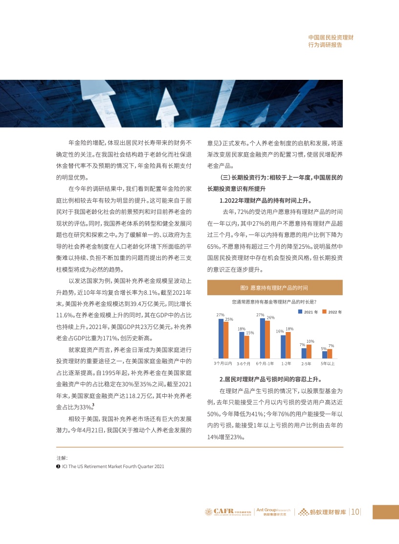 报告显示,在居民的投资理财行为方面,相较于上一年度,中国居民的长期投资意识有所提升。一年以内持有意愿的用户比例明显下降,从去年的72%到今年的65%。同时,居民对理财产品亏损时间的容忍上升。以股票型基金为例,能接受1年以上亏损的用户比例由去年的14%增至23%。