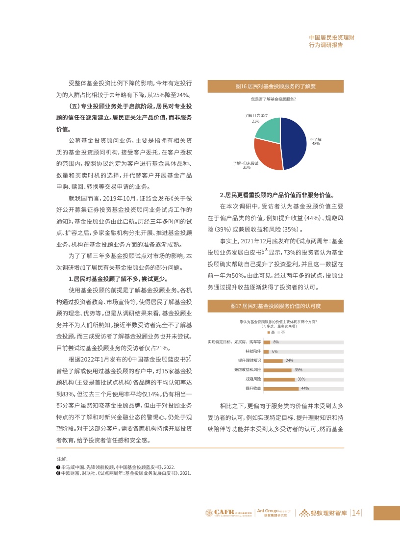 调查显示,要实现长期投资和提升居民的投资理财体验,专业化程度至关重要。报告显示,有28%受访者会因为投顾服务而增加长期投资意愿,同时仍有半数受访者不了解基金投顾服务。