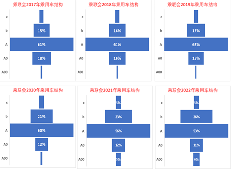 而A级车在从2017年仅有21%的比例,到2019年上升达到54%的比例,随后又下降到24%的比例,呈现剧烈的变化特征。目前A级车是车市的第三大细分市场。