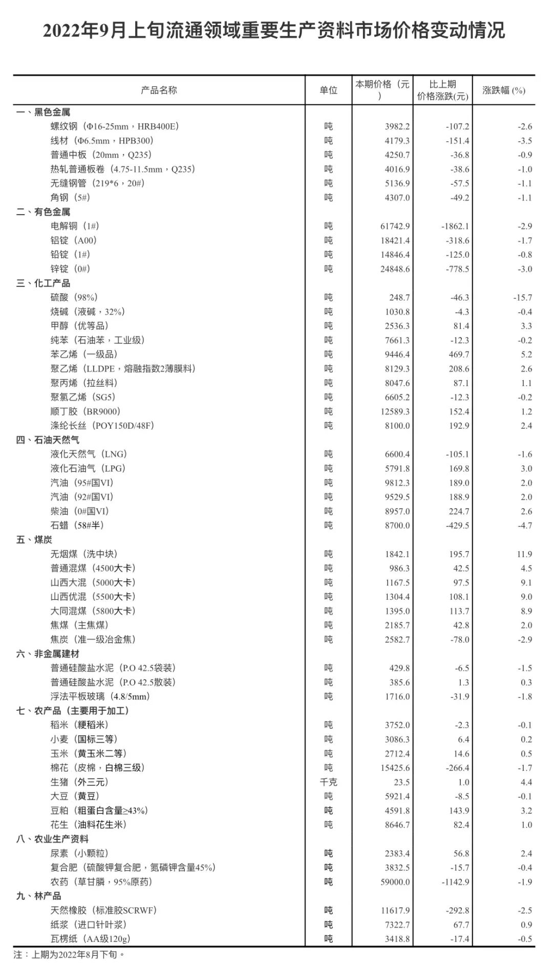 国家统计局:2022年9月上旬流通领域重要生产资料市场价格变动情况 据对全国流通领域9大类50种重要生产资料市场价格的监测显示,2022年9月上旬与8月下旬相比,24种产品价格上涨,26种下降。 更多阅读:国家统计局:2023年4月中旬流通领域重要生产资料市场价格变动情况国家统计局:2024年6月份工业生产者出厂价格同比降幅继续收窄国家统计局:2024年1—6月份全国固定资产投资增长3.9%国家统计局:2024年5月中国采购经理指数运行情况国家统计局:2024年1—5月份全国规模以上工业企业利润增长3.4%国家统计局:2023年8月中国采购经理指数运行情况国家统计局:2023年8月份工业生产者出厂价格同比下降3.0% 环比上涨0.2%国家统计局:2023年6月份居民消费价格同比持平 环比下降0.2%国家统计局:2023年1—6月份全国规模以上工业企业利润下降16.8% 降幅持续收窄国家统计局:2023年6月中国采购经理指数运行情况国家统计局:2023年6月份工业生产者出厂价格同比下降5.4% 环比下降0.8%国家统计局:2023年6月上旬流通领域重要生产资料市场价格变动情况国家统计局:2023年4月份工业生产者出厂价格同比下降3.6% 环比下降0.5%国家统计局:2023年4月份居民消费价格同比上涨0.1% 环比下降0.1%国家统计局: 2022年我国经济发展新动能指数比上年增长28.4%