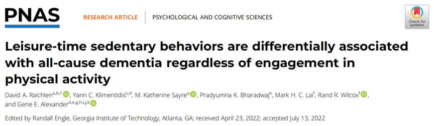 近期,来自美国南加州大学和亚利桑那大学的David Raichlen和Yann Klimentidis等人在《美国科学院院报》(PNAS)上发表重要研究成果[1],他们发现,不同类型的久坐(比如看电视或使用电脑),与新发痴呆风险的相关性迥然相异。