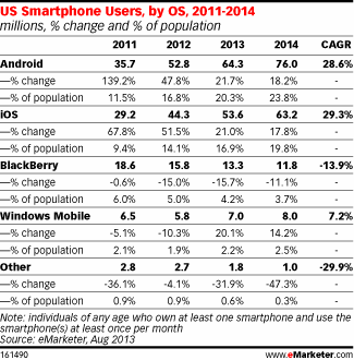 根据eMarketer的预测,到今年底,美国的智能手机用户将从去年的1.2140亿上升到今年的1.4亿,并有望在2014年达到1.599亿。将近46%的人会在手机上安装安卓系统,而使用IOS系统的用户则为38.3%。