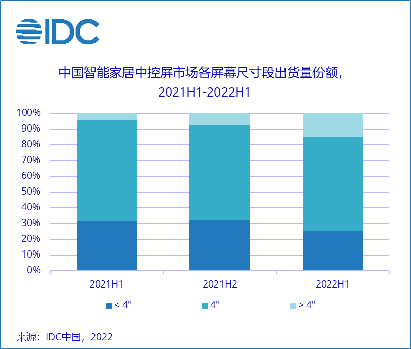 中控屏的屏幕尺寸逐步多元化,更好满足家庭场景下的分布协同需求。4英寸是中控屏市场主流出货尺寸,2022年上半年市场出货量占比约六成。因与86底盒尺寸相同,4英寸中控屏更好的承接了用户对原有开关智能升级需求,市场接受度较高。2022年上半年,4英寸以上市场份额明显提升,其中7-10英寸份是主要增长区间,一方面用户在交互控制及美观装饰上的需求日益丰富,推动了中控屏大屏化发展;另一方面,巨头入局也推动了中控屏在产品功能、形态上的升级和创新。4英寸以下的入门级市场也在吸引越来越多厂商的关注,小尺寸不仅有利于中控屏向更广阔的市场推广,也是推进 “一拖N” 家庭分布式格局构建的重要组成部分。