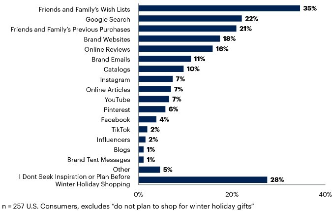 受访者表示,购买礼物的灵感主要来源于收礼人提供的愿望清单或他们过去的购买经历,这可以帮助潜在的送礼人找到正确的方向。购物者也会首先搜索在线评论。
