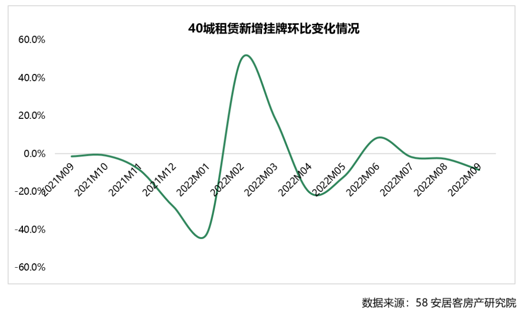 l 9月,全国40城租赁新增挂牌房源供应量环比小幅下跌8.5%,40城租赁需求热度环比下降9%,租赁市场供需呈现普遍降温状态。