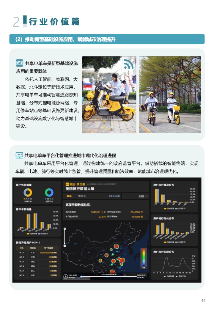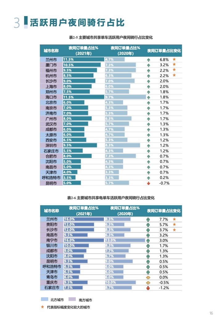 共享单车夜间骑行占比7.7%,对比2020年上涨1.6%,夜间骑行比例增加2%的主要为南方城市;共享电单车夜间骑行占比10.4%,南、北方城市分别由8.7%、7.1%,上升至11.7%、8.8%,上升幅度分别为3.0、1.7%。