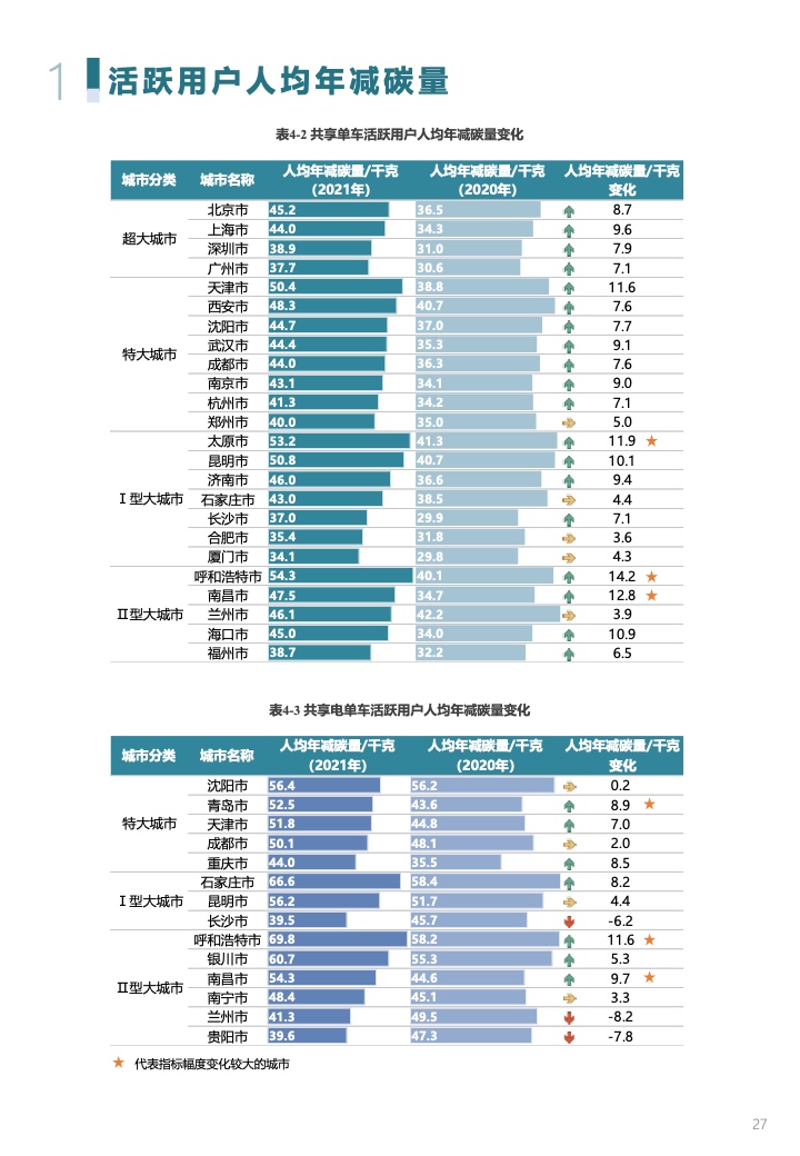 《骑行报告》显示,共享单车单次骑行时长10.7分钟,共享电单车单次骑行时长13.4分钟,对比2020年保持相对稳定,仅个别城市呈现小幅变化。