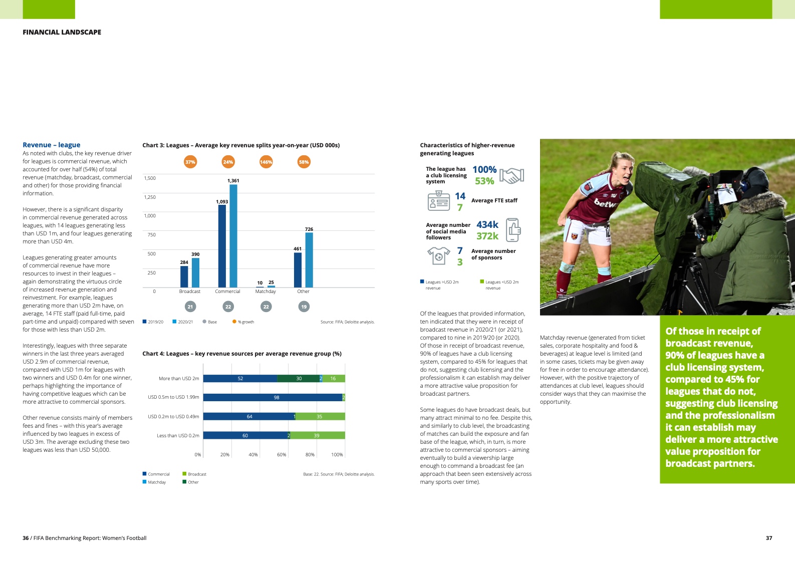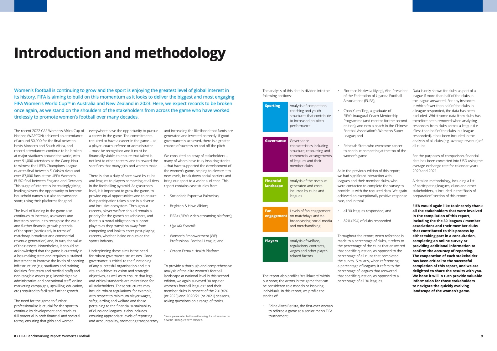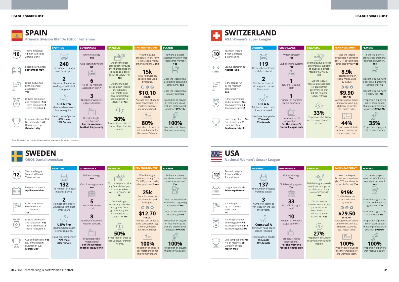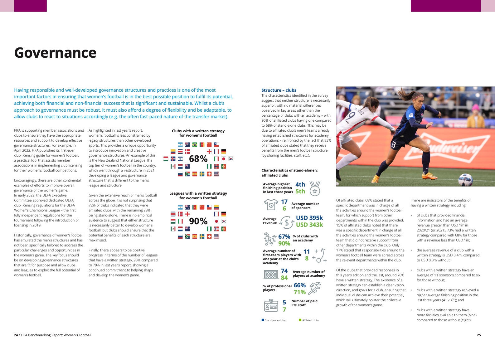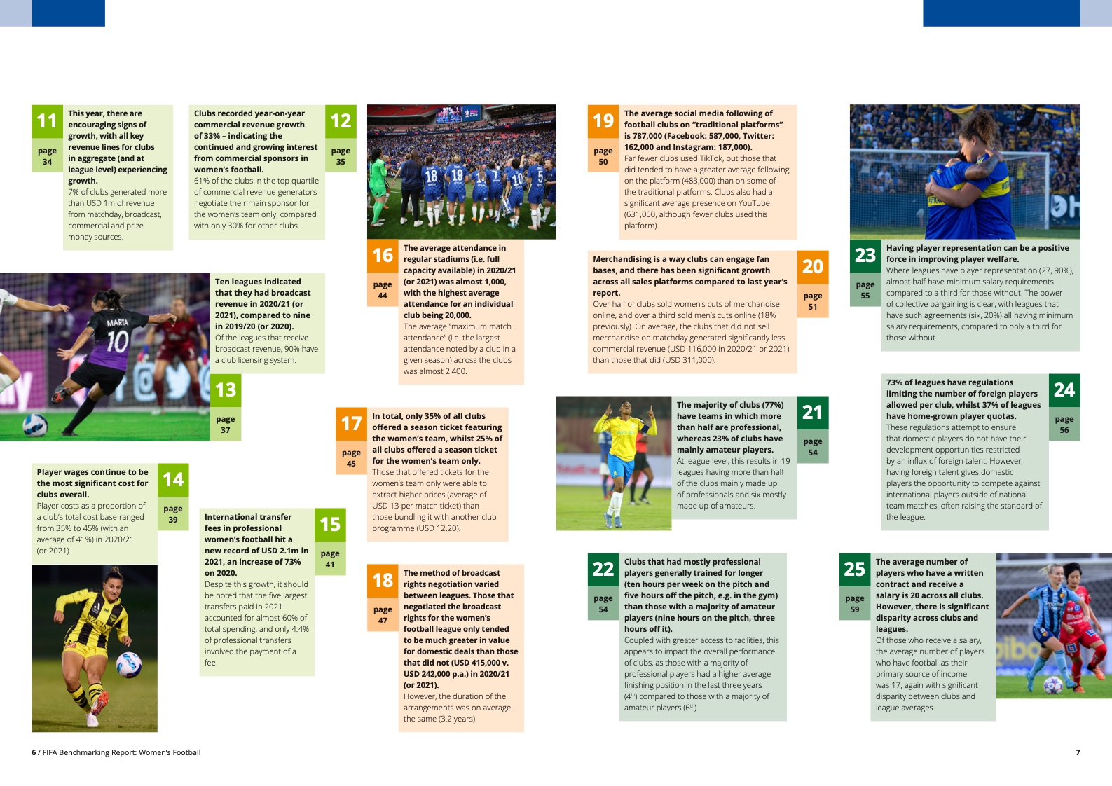 报告收集了全球30个顶级女足联赛内的294个俱乐部的数据,在距离第一版发布仅17个月之后,再次更新数据。国际足联的目的也很明确,就是为了“给全球的俱乐部和联赛提供一个普及工具和参考材料,帮助决策者通过现实中的范本,做出合乎实际的决定,也让投资者能够互相学习。”