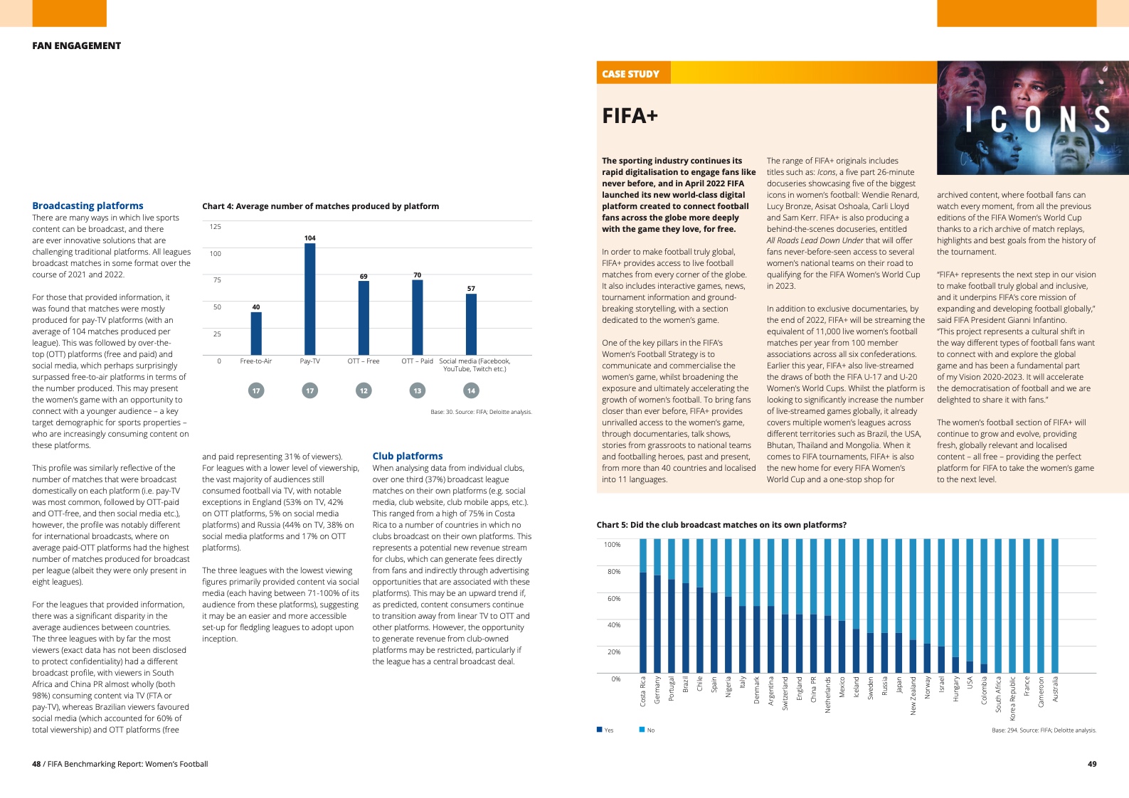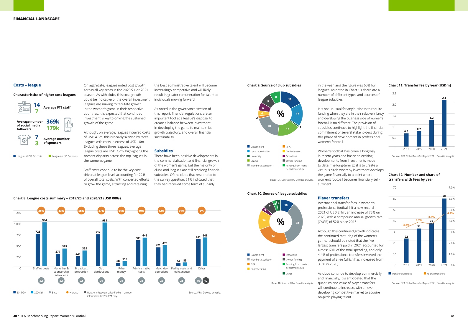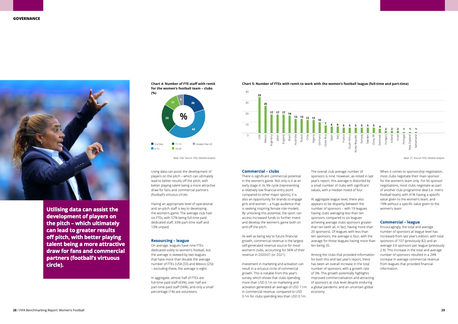 报告中的一些结论也很有参考价值,比如平均每个女足俱乐部有9名全职工作人员;有77%的女足联赛有冠名;2021年的世界女足联赛的国际转会费达到创纪录的210万美元(约合人民币1523万元),比2020年提高了73%;有明确发展计划的联赛和俱乐部成绩都要更好等等。