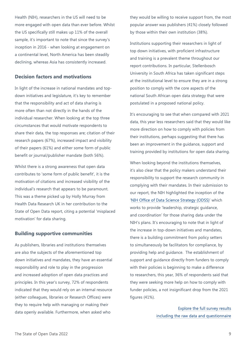 今年报告的主要发现表明,研究人员赞成数据公开获取作为一种普遍做法的趋势日益显著(每五位研究人员中就有四人对此表示赞同)。如今有超过70%的受访者被要求遵守数据共享政策,这一定程度上支持了这一趋势。