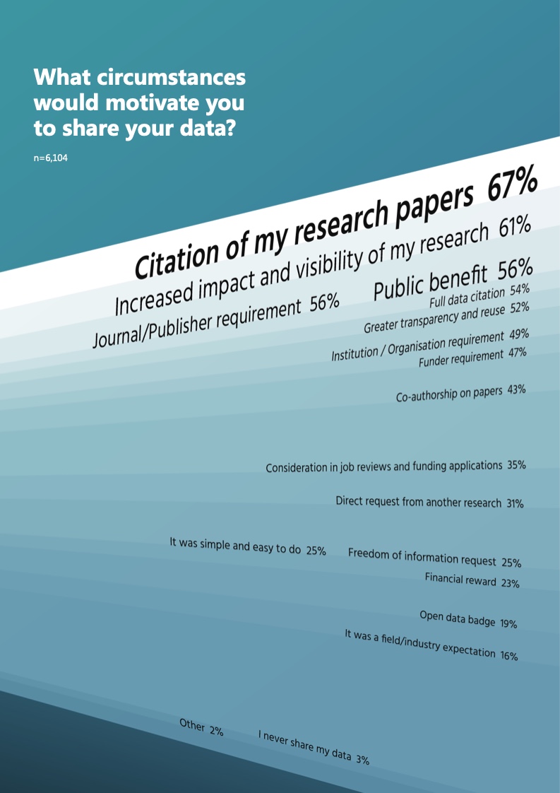 然而,研究人员还是提及了有助于他们分享数据的关键需求:更多有关数据访问、分享和再利用政策的培训或信息(55%),以及长期存储和数据管理策略(52%)。荣誉和认可也再次成为研究人员共享数据时的一个重要主题。此前曾分享过数据的人中,有66%的人获得了他人对其工作的某种形式的认可——最常见的方式是在另一篇文章中的完整引用(41%),其次是在使用了他们数据的论文中成为共同作者。 促使研究人员更倾向于分享其研究数据的因素是对引用量(67%)和研究可见度(61%)所能产生的影响,而不是公共利益或期刊/出版机构的要求(均为56%)。