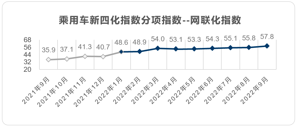 乘联会&安路勤:2022年9月乘用车新四化指数为79.3 中国汽车流通协会汽车市场研究分会(乘用车市场信息联席会,简称乘联会)联合上海安路勤企业管理咨询有限公司(简称安路勤)联合发布的乘用车新四化指数,旨在定期监控国产乘用车市场的新四化发展进程,并通过历史数据比对,判断未来发展趋势。 2022年9月乘用车新四化指数为79.3。其中电动化指数为31.8;智能化指数为44.1;网联化指数为57.8。 通过对2021年9月起的乘用车新四化指数进行追溯计算,可以看到最近13个月来的乘用车新四化指数走势变化。 目前,乘用车新四化指数有三个分项指数,分别为电动化指数、智能化指数和网联化指数。 2022年9月电动化指数为31.8,继续保持稳定上升趋势。 2022年9月智能化指数为44.1,保持平稳增长。 2022年9月网联化指数为57.8,环比上月出现较大幅度增长。 2022年9月全国乘用车市场零售超过192.3万辆,同比增长21.5%,环比增长2.8%。9月各主流车企继续推进终端优惠活动力度,叠加购置税减半等政策端刺激,乘用车市场整体销量继续保持稳步增长。 2022年9月新四化整体指数79.3,继续保持上升趋势。9月全国新能源乘用车销量超61万辆,较8月增长15.4%,销量的显著增长也推动本月电动化指数继续攀升;9月乘用车市场共有44款改款车型上市,随着更多智能网联属性车型的换代上市,本月智能化指数和网联化指数也持续保持上升态势。 展望10月,随着车辆购置税减半政策实施进入倒计时阶段,潜在消费者购车的关注度有所提升,有望进一步推动市场销量上升。新能源市场方面,临近年底时间节点,新能源补贴政策将退出,消费者购车迫切度将提升,有利于进一步提升电动化指数继续攀升。 更多阅读:乘联会&安路勤:2021年12月乘用车新四化指数为69.4乘联会&安路勤:2023年4月乘用车新四化指数为78.7乘联会&安路勤:2021年12月乘用车新四化指数为69.4乘联会&安路勤:2022年12月乘用车新四化指数为79.4乘联会&安路勤:2021年6月乘用车新四化指数为65.8乘联会&安路勤:2021年5月乘用车新四化指数为66.2乘联会&安路勤:2021年7月乘用车新四化指数为65.6乘联会&安路勤:2021年4月乘用车新四化指数为66.1乘联会&安路勤:2023年3月乘用车新四化指数为79.0乘联会&安路勤:2023年2月乘用车新四化指数为78.8乘联会&安路勤:2022年11月乘用车新四化指数为82.9乘联会&安路勤:2022年6月乘用车新四化指数为74.3乘联会:2022年10月乘用车新四化指数为80.3乘联会&安路勤:2023年1月乘用车新四化指数为78.7乘联会&安路勤:2021年10月乘用车新四化指数为67.9