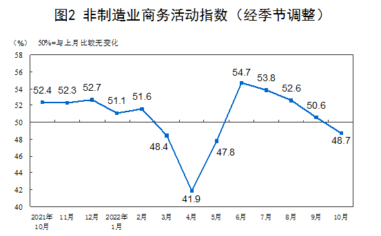 10月份,非制造业商务活动指数为48.7%,比上月下降1.9个百分点,低于临界点。