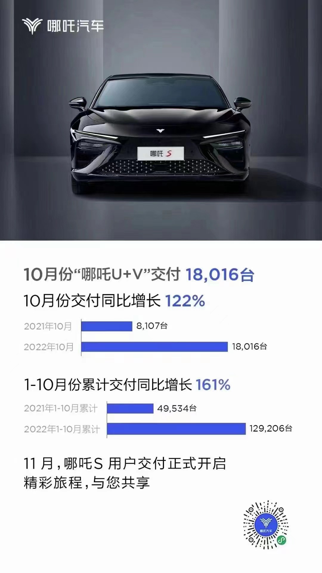 近日,哪吒汽车公布 10 月交付数据,哪吒汽车 U+V 车型合计实现交付 18016 台,同比增长 122%;1-10 月累计交付新车 12.9 万台,同比增长 161%。