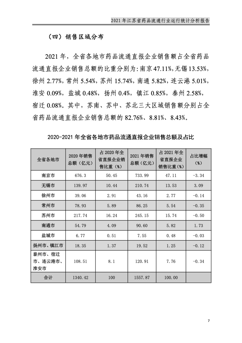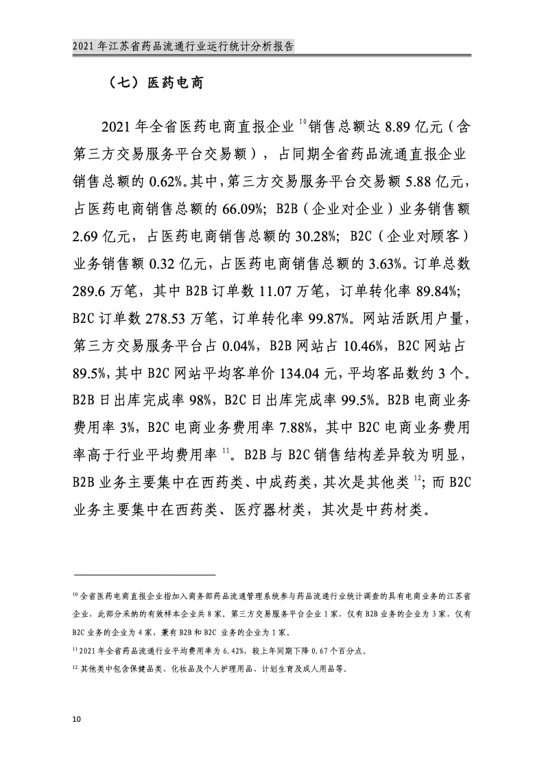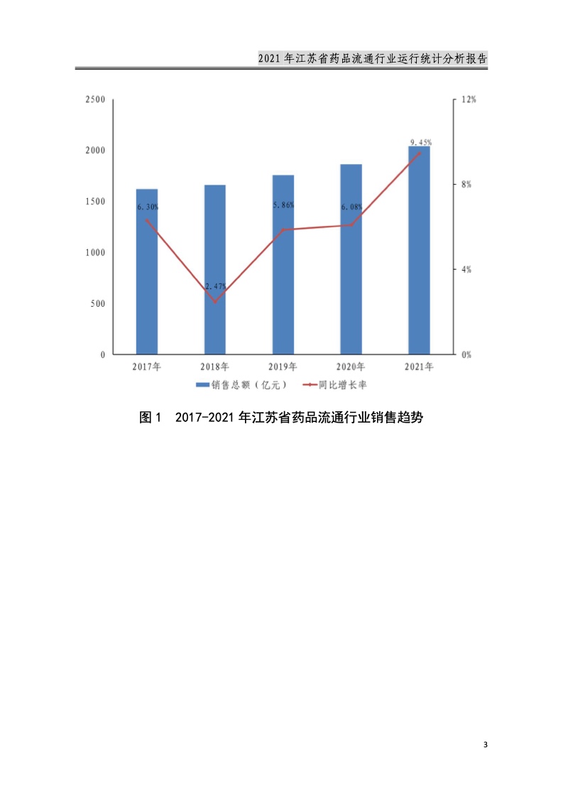 2021 年全省药品流通市场销售规模稳步增长,增速略有 上升。统计显示,全省七大类医药商品销售总额 2039.10 亿元 1, 扣除不可比因素同比增长 9.45%,增速同比加快 3.37 个百分点。 其中,药品零售市场 358.98 亿元,扣除不可比因素同比增长 8.82%,增速同比放慢 2.22 个百分点 。