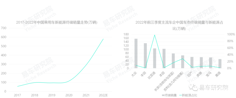 很多机会除了对手积极争取,往往也是自己送的:2020-2021 年,中国新能源的终端销量由 100 万辆升至 300 万辆,2022 年有望逼近 600 万辆,但贡献主要来自比亚迪、五菱等少数车企;截至 2022 年前三季度,比亚迪在售产品几乎是 100% 新能源化,综合成本优势显著,大众、丰田、本田、日产、奔驰、宝马、奥迪等全球车企的在华新能源占比清一色低于 10%,仍陶醉于燃油车的最后晚餐;