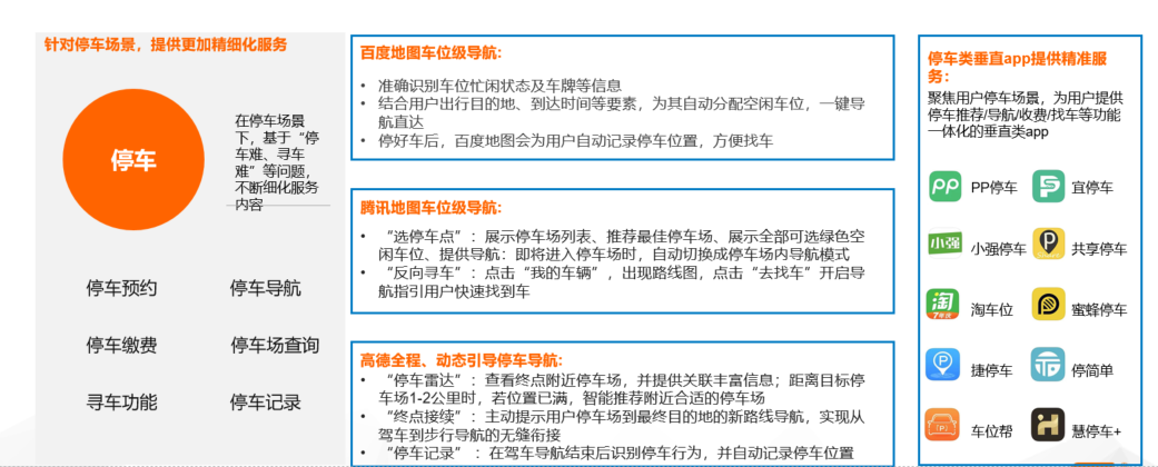 ● 地图平台、停车类垂直平台不断推进智能推荐停车点位、智能导航停车点、智能停车收费、停车场智能找车等功能一体化促进提升车主停车体验。