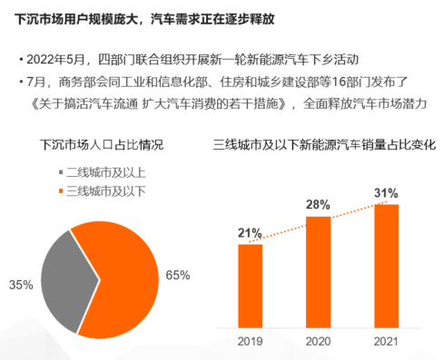 ● 下沉市场拥有庞大的用户规模,且从新能源汽车销量占比变化趋势来看,下沉市场的汽车需求正在逐步释放。