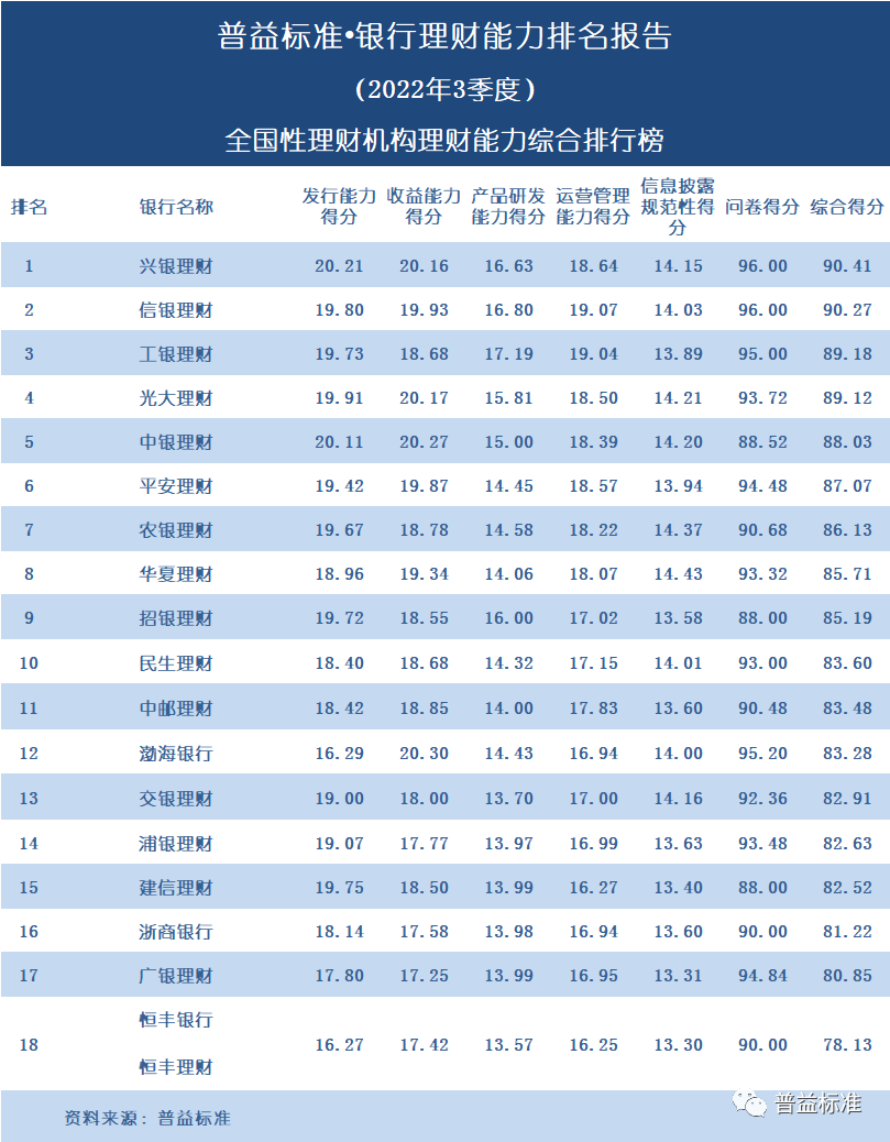 2022年3季度,全国性理财机构中,理财能力综合排名前五的银行依次是兴银理财、信银理财、工银理财、光大理财、中银理财。