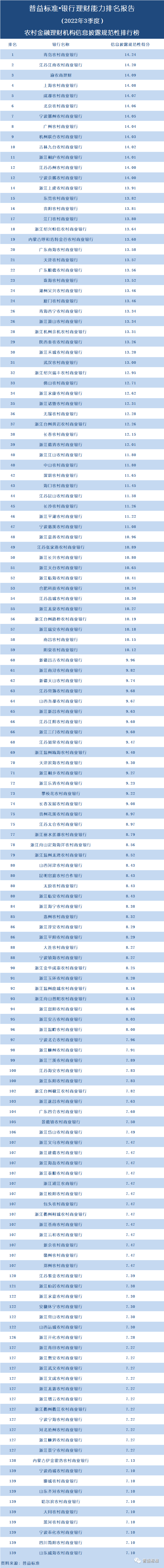 2022年3季度,农村金融理财机构中,信息披露规范性排名前十的银行依次为青岛农商银行、江苏江南农商银行、渝农商理财、上海农商银行、成都农商银行、北京农商银行、宁波鄞州农商银行、广州农商银行、杭州联合农商银行和吉林九台农商银行。