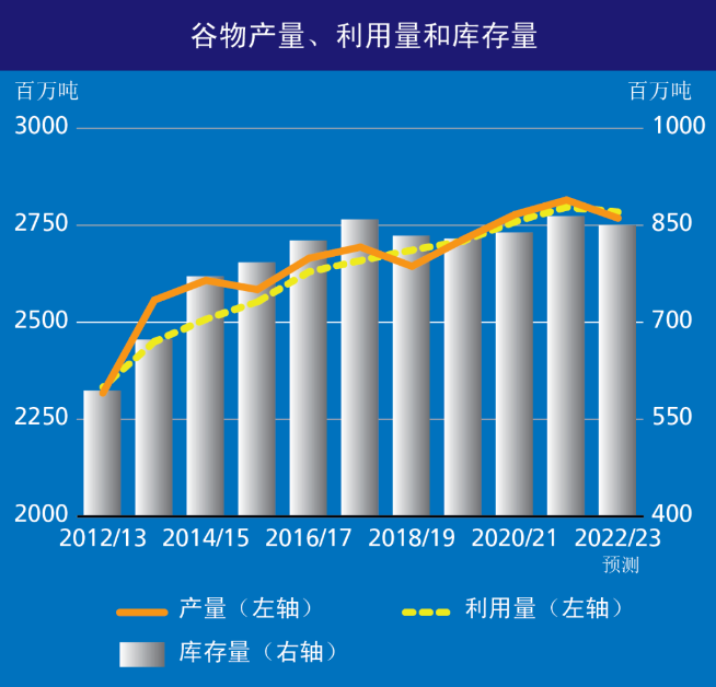 同时,2023 年季末世界谷物库存量预报数为 8.41 亿吨,较期初水平下降 2.0%。