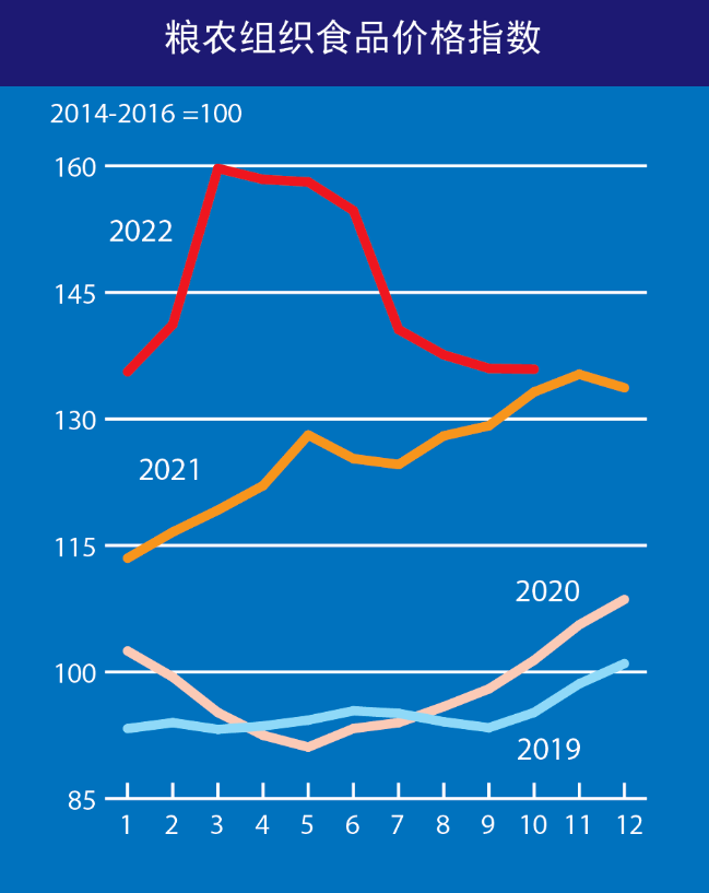 粮农组织食品价格指数衡量一揽子食品类商品国际价格月度变化状况。2022 年 10 月,粮农组织食品价格指数平均为 135.9 点,环比微跌。与今年 3 月的最高值相比,10 月指数下降了 14.9%,但与去年 10 月相比仍高出 2.0%。