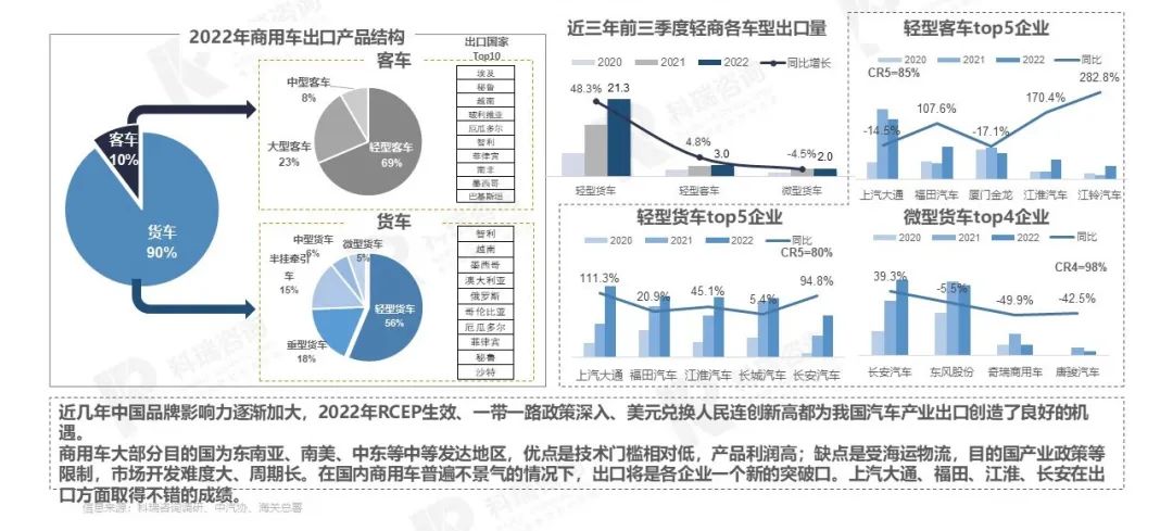 - 2022年1-9月,我国出口形势保持良好。1-9月份,我国出口汽车226.3万辆,同比增长51.6%,商用车42.1万辆,同比增长38.8%,其中货车出口37.8万辆,占比90%。而2021年全年我国出口商用车40.2万辆,2022年前三季度已经超过2021年全年的出口销量。