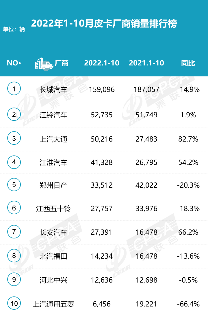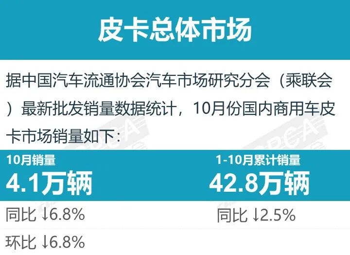 根据乘联会皮卡市场信息联席会数据,2022年10月份皮卡市场销售4.1万辆,同比2021年10月下降6.8%,环比今年9月下降6.8%。由于去年疫情下皮卡生产受阻,今年的皮卡生产形势改善,导致2022年10月皮卡的产销表现较强,尤其是出口增长33%的表现较强,这也是汽车行业共同体现的出口外销走强的特征。今年1-10月的总体皮卡走势相对较平稳,达到42.8万辆,较2021年1-10月下降2.5%,相对于卡车的同比剧烈下降,皮卡产销表现还是很好的。
