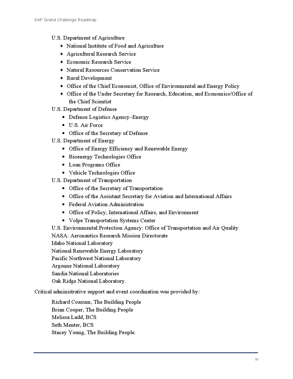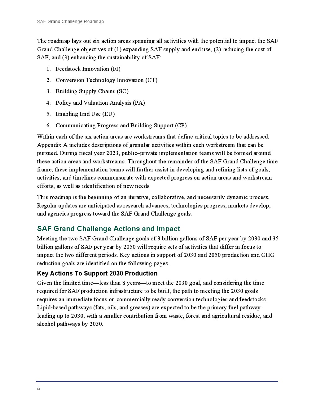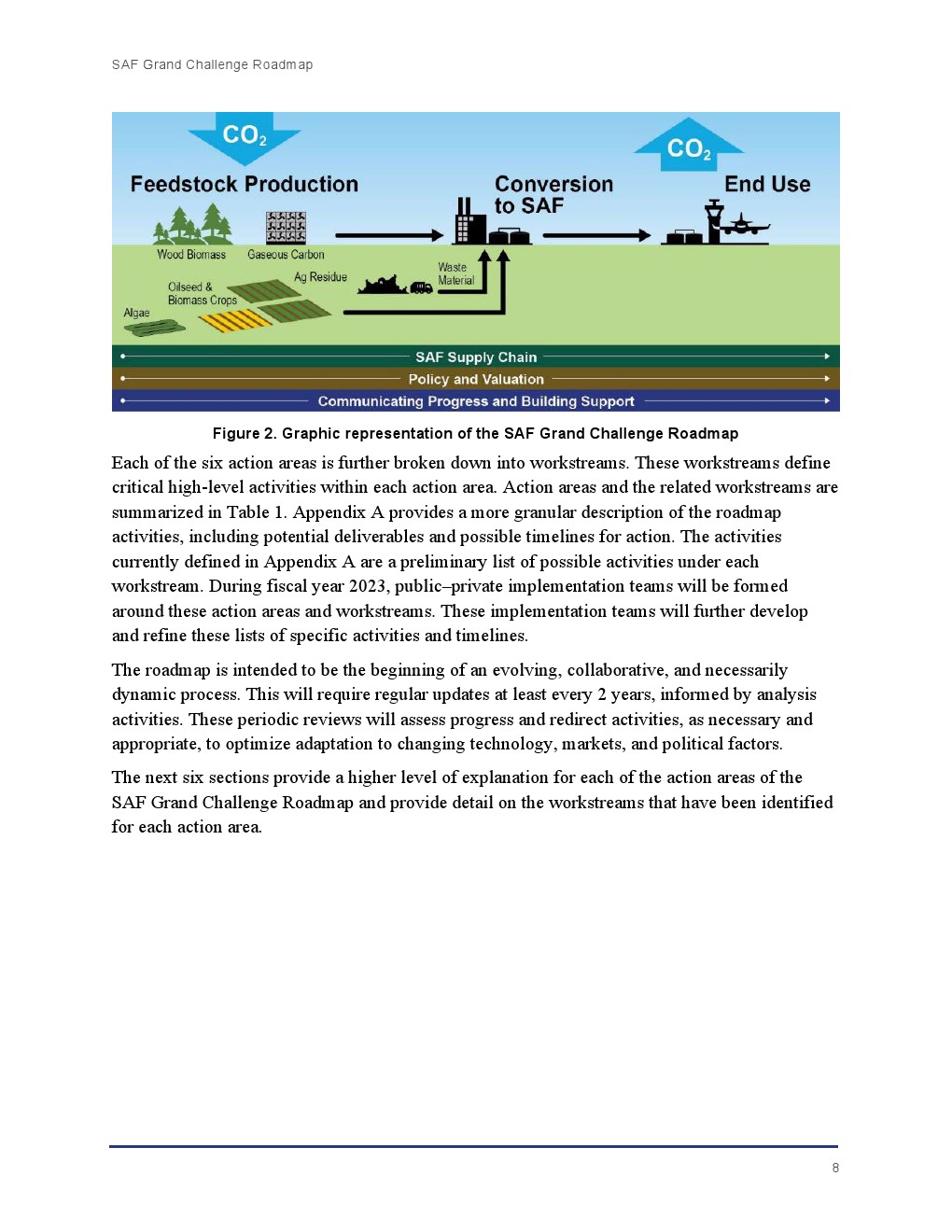 由DOE、DOT和USDA领导的跨部门团队与EPA、其他政府机构以及国家实验室、大学、非政府组织(NGO)以及航空、农业和能源行业的利益相关者合作,制定了SAF大挑战路线图。