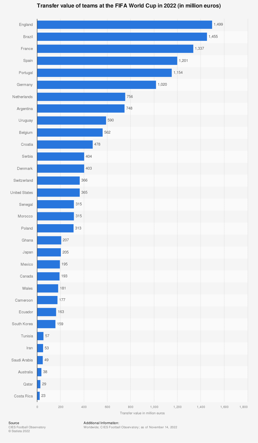 在2022年卡塔尔世界杯之前,英格兰队的集体转会价值最高,接近15亿欧元。本届世界杯上最便宜的球队是哥斯达黎加队,身价仅为2300万欧元,约为这一数字的1.5%。