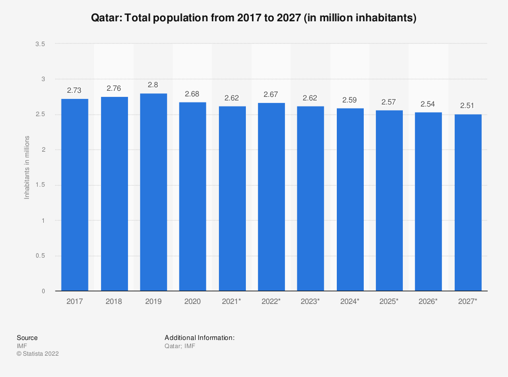 该统计数据显示了卡塔尔从2017年到2020年的总人口,预计将达到2027年。2020年,卡塔尔总人口约为268万居民。