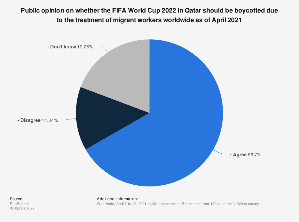 2022年国际足联世界杯计划于2022年11月在卡塔尔举行。在比赛前,出现了关于移民工人在卡塔尔为赛事施工期间因工死亡的报道,其中大部分来自印度和尼泊尔。在2021年4月的一项调查中,当被问及他们的国家是否应该因为移民工人的待遇而抵制世界杯时,发现66.7%的受访者表示同意。
