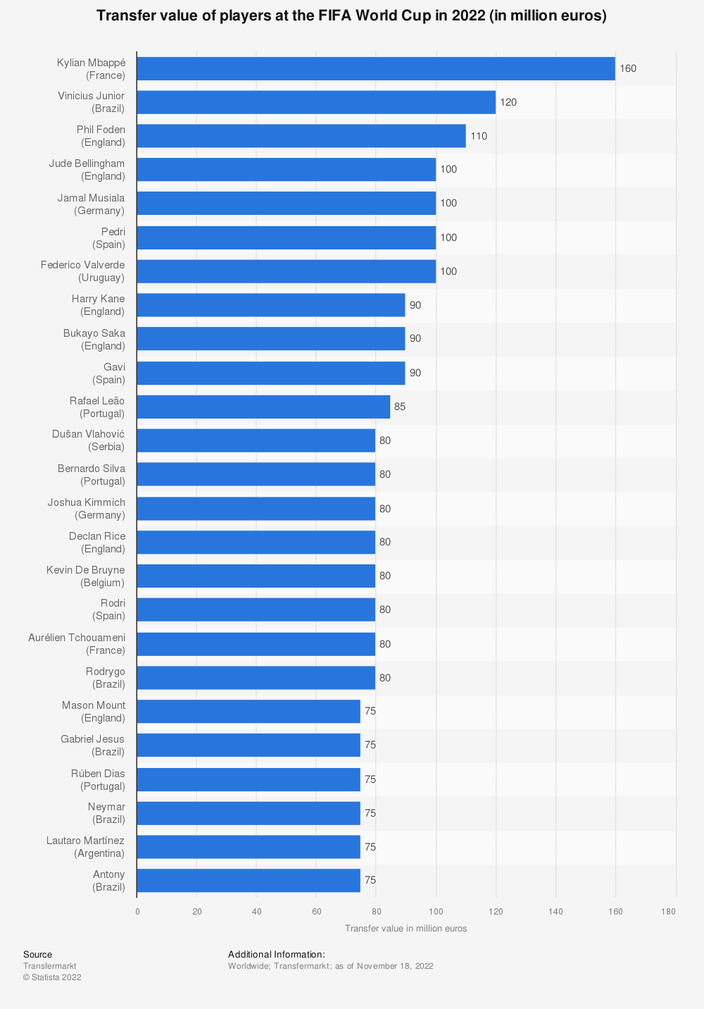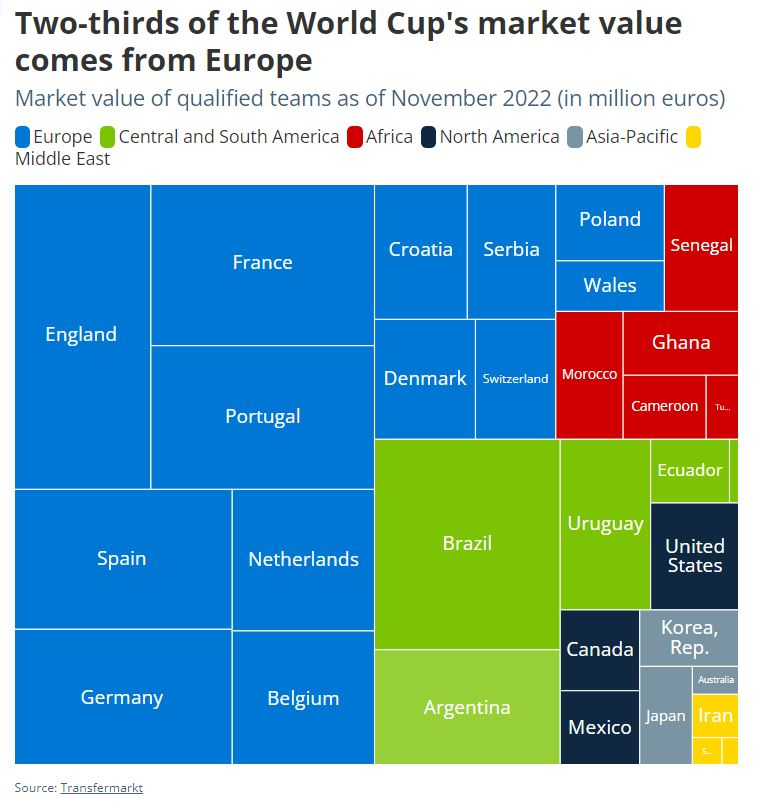 世界杯三分之二的市值来自欧洲。截至2022年11月,参赛球队市值(百万欧元) 数据来源:Statista.com