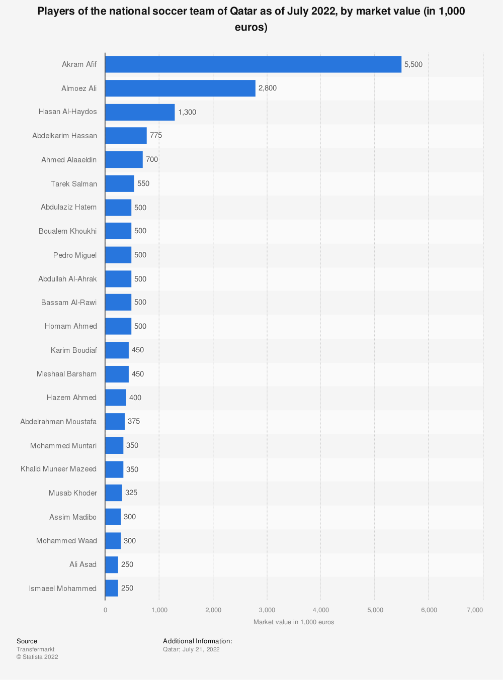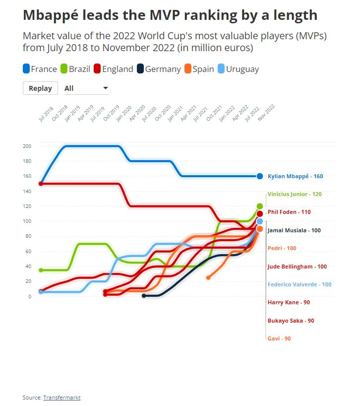 在威尔士战胜乌克兰,完成了最后剩下的常规预选赛之路,确保了64年来首次获得世界杯资格后,澳大利亚和哥斯达黎加是最后两支通过赢得洲际附加赛获得资格的球队,完成了本届世界杯的名单。英格兰队拥有最高的市场价值,约为13.2亿欧元,其次是法国,为10.8亿欧元。参加比赛的市值最高的球员是法国队的Kylian Mbappé,他在四年前的决赛中打进一球,帮助法国队获得冠军,还获得了那届比赛的最佳年轻球员奖。Mbappé是巴黎圣日耳曼俱乐部的球员,目前身价为1.6亿欧元。另一方面,卡塔尔首次获得世界杯主办国资格。与大多数国家相比,东道主球队的规模要小得多,球队的总市值也排名最低,约为1400万欧元。阿克拉姆·阿菲夫是头号球星,他的市场价值达到了400万欧元。