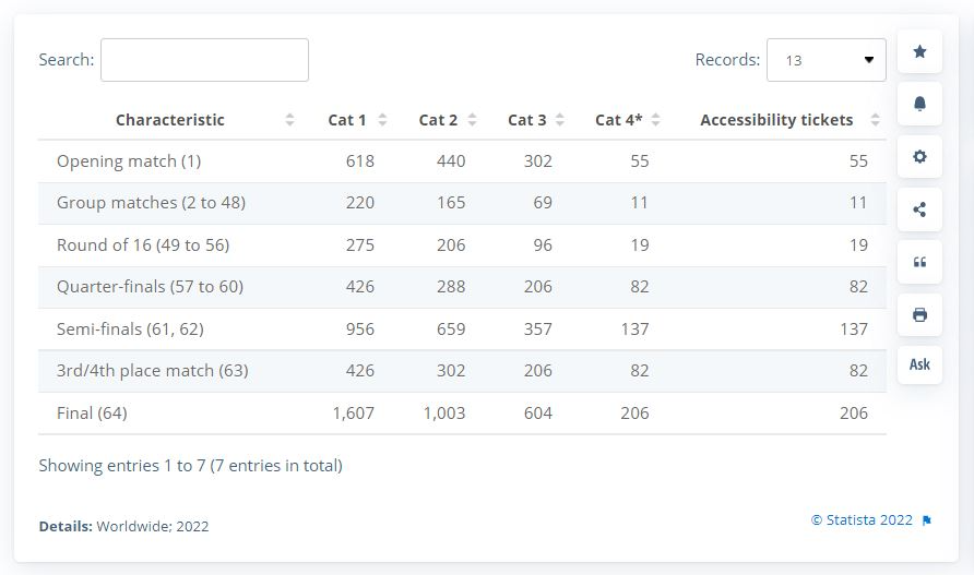 较高类别的门票价格大幅上涨,决赛的第一类门票价格为5,850卡塔尔里亚尔,换算成美元约为1,607美元。这标志着比上届俄罗斯世界杯时的1100美元增加了46%。最便宜的门票是第4类门票。按照世界杯期间的惯例,这些门票中有许多是为当地居民保留的,以便与来自全球各地的球迷一起体验比赛。对于小组赛,第4类门票的售价为11美元,比较合理。特定球队系列赛的票价从227美元的三场第三类小组赛到4754美元的七场第一类门票,包括开幕赛、四分之一决赛、半决赛和决赛。
