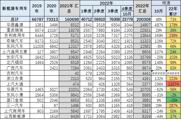 2022年的新能源专用车市场总体看没有特别的强势厂家,吉利和奇瑞等全国性的优势企业不多,专用车与乘用车的竞争格局明显差异。