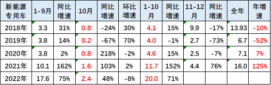 新能源专用车2021年市场销量16.05万台,同比增长125%;2022年10月的新能源专用车市场销量2.38万台,同比增长48%。2022年1-10月达到20万台,同比增长71%,增速较强。