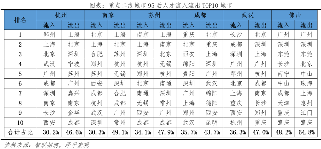 从来源和去向地看,杭州、南京流入流出城市前三均含北京、上海,且流入流出合计占比均接近8.0%、16.6%,说明两地发展所需人才主要在一线城市中,同时也具有从一线城市抢夺人才的能力;苏州流入流出城市前二均为上海、南京,合计占比分别为10.0%、17.2%,其中上海对苏州虹吸效应明显,从苏州流向上海95后人才占比为10.1%;此外,依托于经济增长强动力和地理位置优势,长三角地区人才互动频繁,杭州、南京、苏州流出城市均有6个位于长三角城市群,分别辐射北部的合肥、南通和南部的宁波、嘉兴等城市。成都则得益于成渝地区双城经济圈的大力建设,加速与重庆、北上广深等一线城市间的人才交流,成都流入流出城市前二为重庆、北京,合计占比分别达15.8%、17.4%。武汉地处长江与京广铁路大动脉的十字交汇点,有“九省通衢”之称,95后人才来源地遍布各地,前十流入流出城市均属于9个不同的省级行政单位,流出武汉的城市相对集中,其中流出前四大城市为北京、深圳、上海、广州,均为一线城市,合计占比27.8%。佛山今年跻身95后人才吸引力第十位,与珠三角城市群人才交流频繁,流入城市有5城位于珠三角城市群,合计占比达38.3%,流出城市有8城位于珠三角城市群,合计占比达58.6%,流出城市相对集中;其中,佛山流向广州和广州流向佛山的95后人才比值为0.74,这表明95后人才从广州净流入佛山,即95后从广州流向佛山的人才多于佛山流向广州的人才。一方面,佛山毗邻广州,两地经济文化交流便利,政策正在积极推进“广佛同城化”;另一方面,佛山自身制造业和对外贸易发达,经济增长活力更足,对人才有一定吸引力。2022年上半年佛山规模以上工业增加值同比增长3.1%,进出口总额同比增长12.6%,而同期广州规模以上工业增加值同比增长1.8%、进出口总额同比下降5.7%。