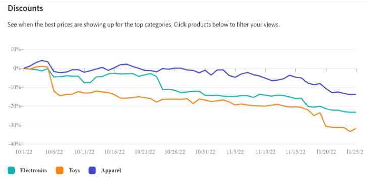 就折扣吸引消费者购物而言,Adobe 的数据显示,尽管消费者面临通胀压力,但大幅折扣确实是推动销售额同比增长的关键因素。也就是说,电子产品和玩具的销售被那些无法拒绝折扣的购物者所抢购。