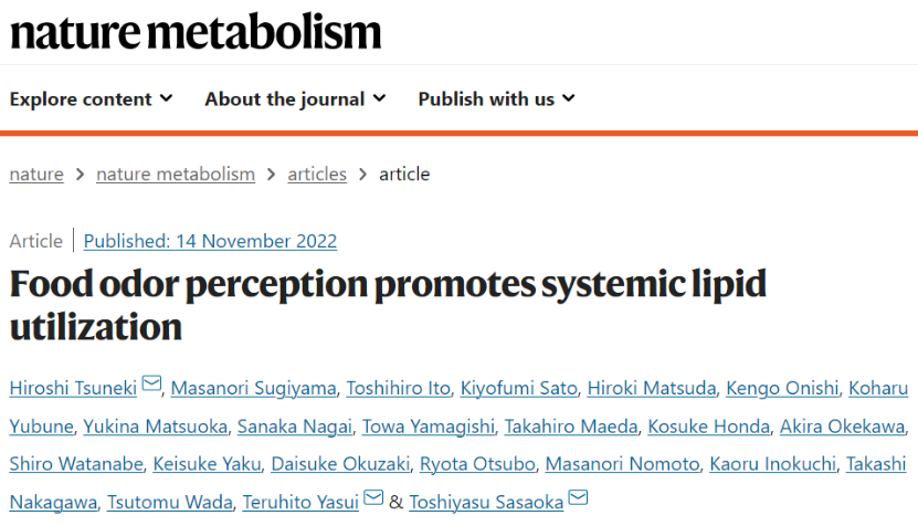 1. Tsuneki H, Sugiyama M, Ito T, Sato K, Matsuda H, Onishi K, Yubune K, Matsuoka Y, Nagai S, Yamagishi T, Maeda T, Honda K, Okekawa A, Watanabe S, Yaku K, Okuzaki D, Otsubo R, Nomoto M, Inokuchi K, Nakagawa T, Wada T, Yasui T, Sasaoka T. Food odor perception promotes systemic lipid utilization. Nat Metab. 2022 Nov 14. doi: 10.1038/s42255-022-00673-y. Epub ahead of print.