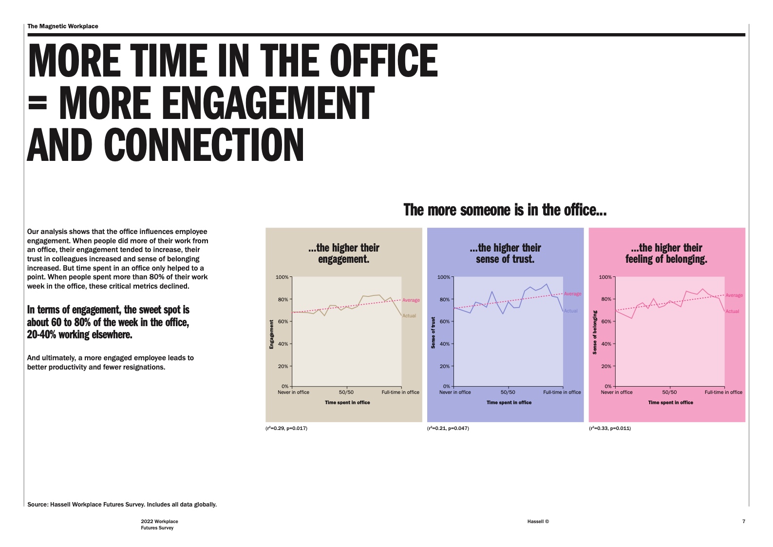 当员工可以选择花60%至80%的时间在办公室工作的情况下,会感到更有参与感。在疫情刚开始的阶段,我们注意到了办公空间参与度呈下降趋势。现在,员工在办公室工作相对较长时间了,参与度、归属感和相互之间的信任都增强了。